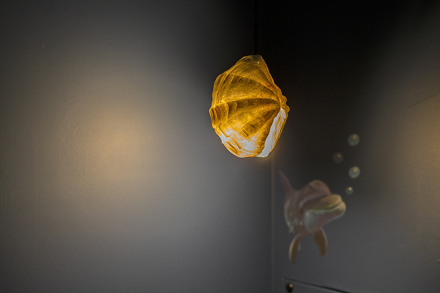 まるで海の中のようなトイレ。「いつか照明器具に加工しようと思っていながら、そのままになっていた沖縄の思い出の貝殻。増田さんが照明にして下さいました!」