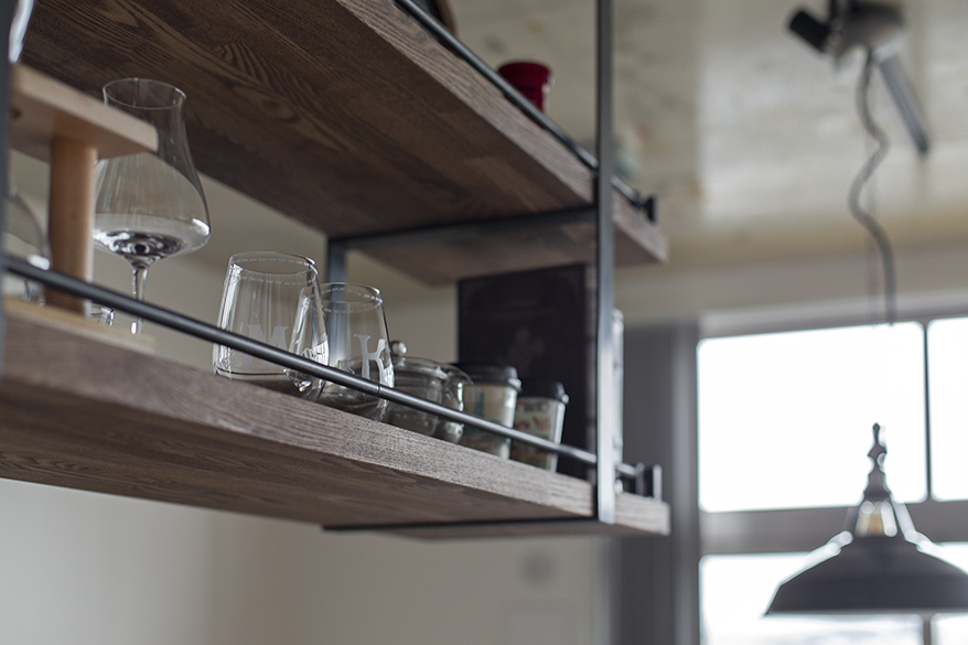 パパの「絶対、木板×アイアンの吊り棚が欲しかった」で実現。お酒とグラスを飾っていい気分