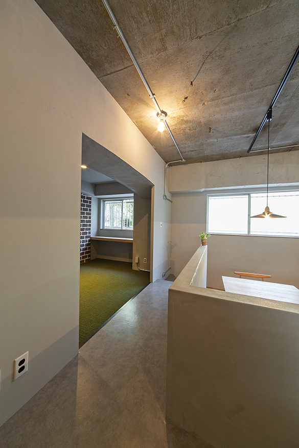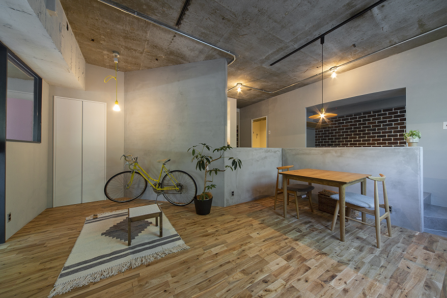 一段低くなっているLDからキッチンや寝室も見渡せる、ゆるりとゾーニングされたスキップフロアの1LDK。ナナメの壁や寝室のレンガ、たわんだ梁がアクセントです。店舗時代の魂も残り、完全プライベート、というよりは、どこかパブリックを意識した空間。友達がよく遊びに来るご夫婦や、なにか教室を開きたい方、モノをつくるクリエーター向きかもしれません。