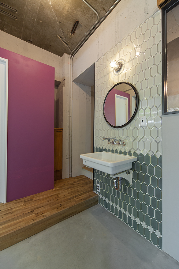 土間スペースの上がり框。バイオレットのカラーが素敵なトイレルームです。手前には手洗いをつけて、子どもがただいまーと帰ってくると、ここで手を洗ってから、家へと入ります。モスグリーンのヘキサゴンタイルにまあるい鏡がかわいい