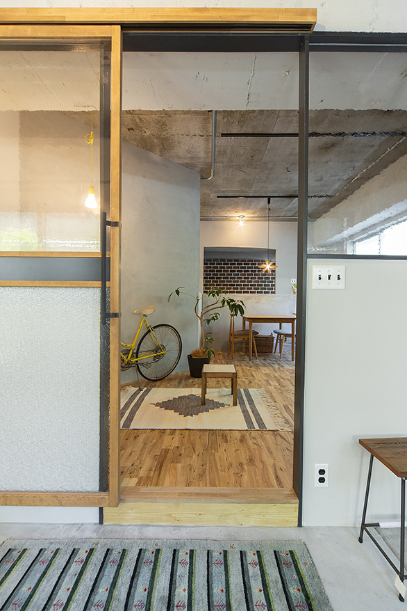 長細ーい土間スペース、もともと店舗だっただけに、道路側に玄関ドアがあります。窓とドアが一体となった、T字型の開口部が面白いですね。ドアはアウトセットの引戸になっています