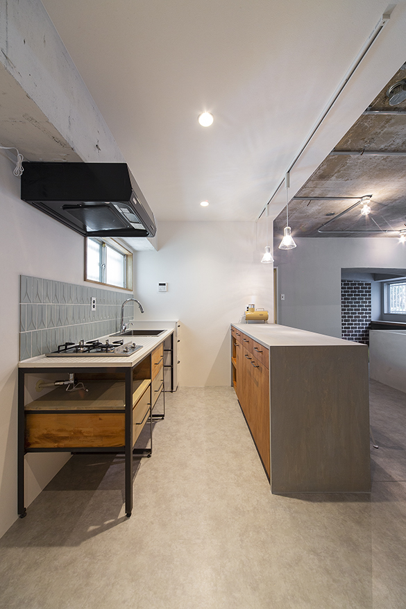小窓つきオリジナルキッチンはオープンタイプのフレキシブルな感じが◎。そのぶん、アイランドカウンターは収納をしっかり。ダイニング変わりにも使えます。和柄のタイルは「ずらし貼り」というテクニックを使っています。奥に寝室のレンガの壁が見えますね
