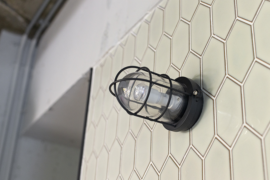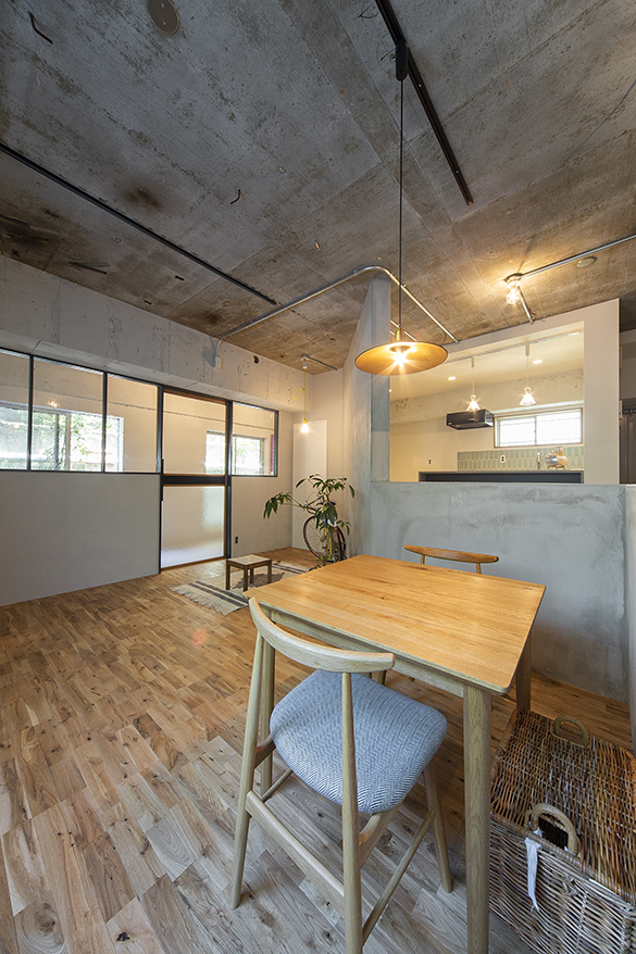 では、ぐるりと一周してみましょう。まずは、ダイニングスペース。高低差のあるナナメの間仕切り壁で、空間をゾーニングしています。背の高い壁はブロック塀をモルタルで塗装しました。ドアを開けると土間スペースが広がり、掃き出し窓からお庭へと出ることができます。この掃出し窓、店舗時代につぶされて、今回復活しました。断熱性能もアップしています