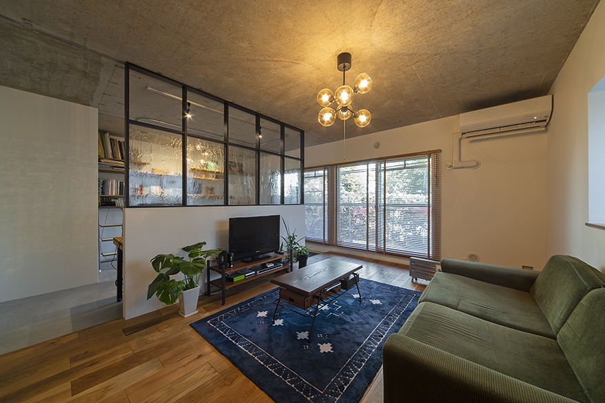 ガラス×木枠の間仕切り壁はトラックの店舗からイメージ。一番上はガラスを入れてないので、風通しもいい。掃出し窓は二重サッシにすることで、断熱性能アップさせました。「防音効果もありますね」