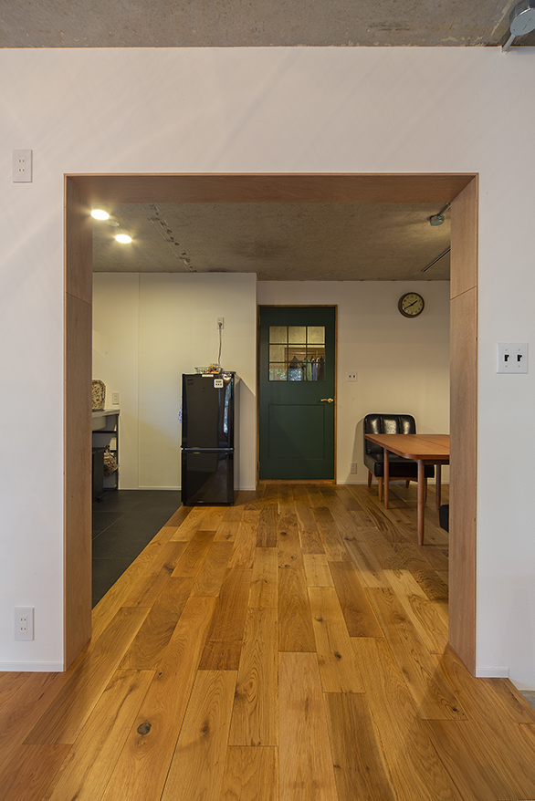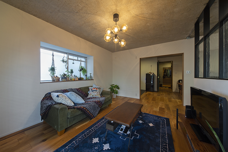 キッチンからDKを通り抜けると、リビングにたどり着きます。オークの無垢床、剥き出しの天井、クロス張りの壁、バランスがいいですね。出窓は解体した時に少し台形になっていることが発覚。「これは面白いですね」と、下枠だけ新しくして、カタチはそのままいかしました。グリーンが映えますね。ここも、ドアをつけずに開口部だけ。額縁みたいです