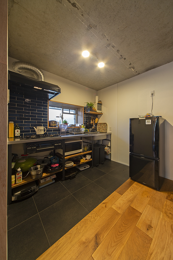キッチンは、男っぽいステンレスのオープンキッチンに。アイアンバーをうまく活かして収納していますね。出窓は下枠を交換するついでに、四角に囲ってカッコよくなりました。壁はネイビーのタイル、床もタイルに切り替えてます