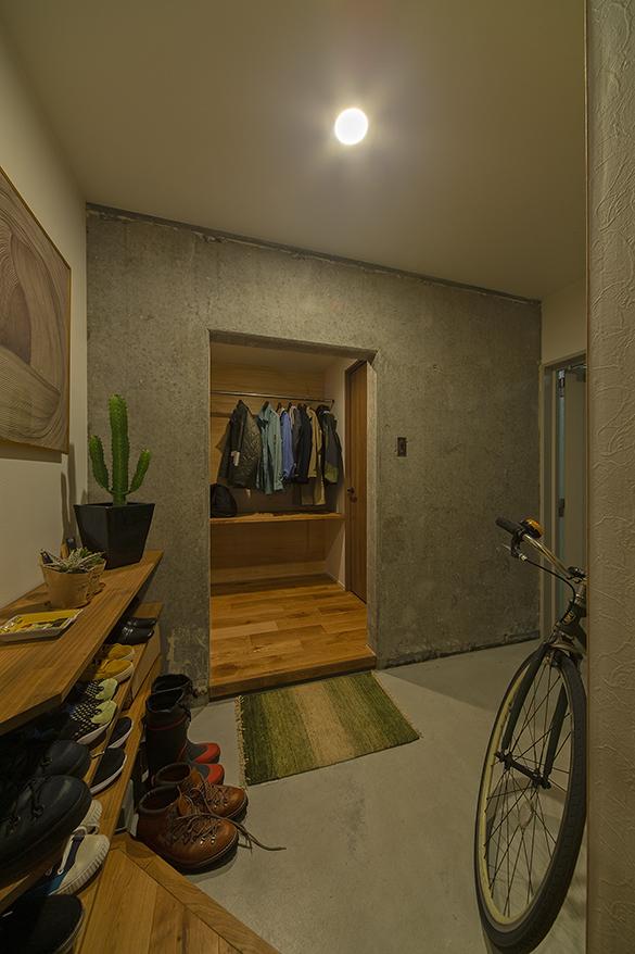 狭かった玄関は、「アウトドア用品やロードバイクが置きたい」と、土間スペースを広げました。壁構造なので開口部はドアをつけずにそのまま、オープンクロゼットがちらりと見える塩梅がいいですね。土間スペースを広げたことで、前はつながっていた左右の部屋が分断、結果、右側は離れ的なプライベートルームとなりました