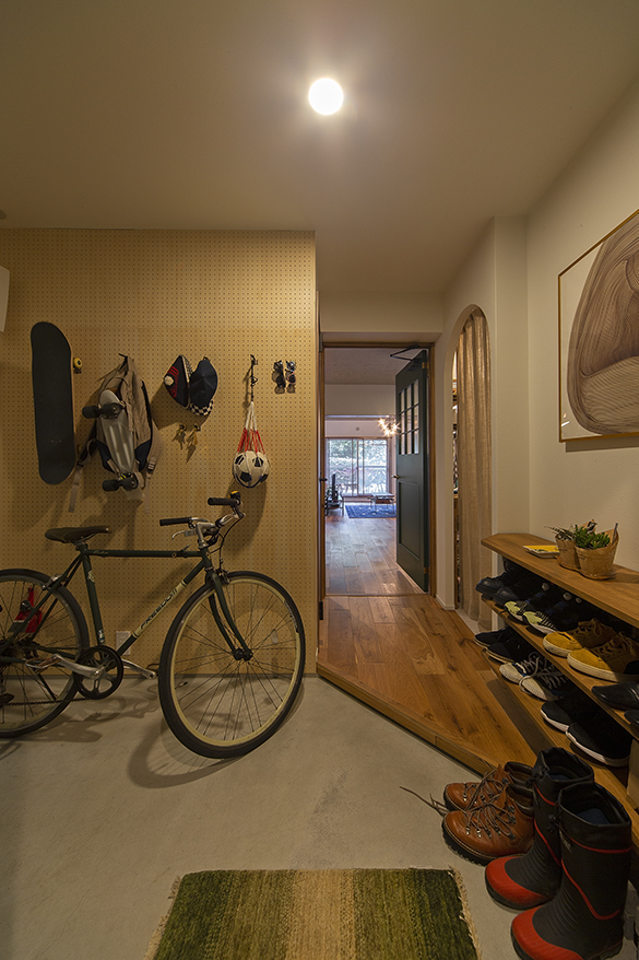 玄関入って左側はLDKへと続きます。玄関は有孔ボードをつけると、スケボーなどもすっきりおさまりました。ナナメの上り框にすることで、玄関と廊下をスムーズにつなげます