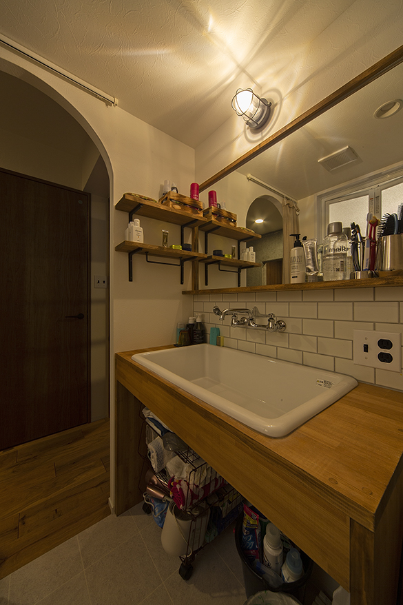 Rの入口を入ると、そこは洗面室。タイル張りのオリジナルで、ここも「見せる」収納をうまくつくりました