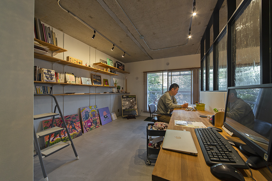 壁構造は間取りをあまり変えることはできません。なので、ディテールから話が進みます。Nさんは、グラフィックデザイナーで、仕事とは別に作品もつくります。「だから、アトリエが欲しい」。バルコニー側にあった2つの部屋の壁はトルことができたので、まずは大空間にします。「どうしても欲しかった」黒い木枠×ガラスの壁で、ゆるやかにアトリエとリビングを間仕切ります。これが、めちゃくちゃカッコいい。アトリエは庭と室内をつなぐイメージで、床はモルタルの土間スペースに。壁1面だけ塗り壁にして、棚が浮いているようデザインしました。作品の色使いも、本当に素敵です。