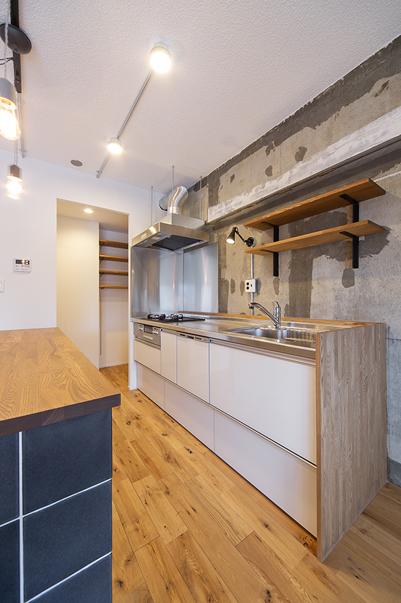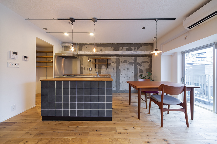 剥き出しの壁の表情は築44年ならでは。床はオーク、ふかした壁はクロス、天井は剥き出しの白塗装で仕上げました。レビトンのアメリカンスイッチはシンプルハウスのスタンダード。タイル張りのオリジナルカウンターは大人っぽく、深みのある色が印象的です