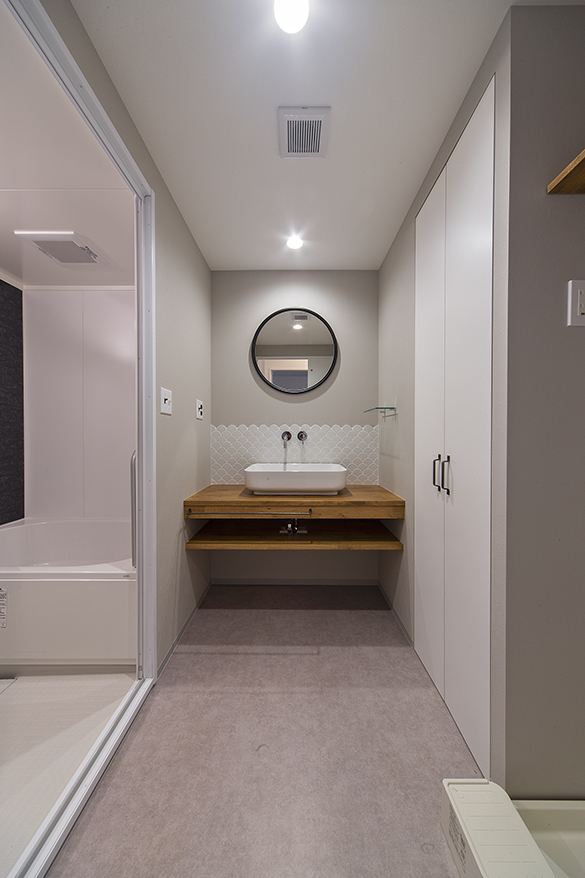 なみなみタイルや円形ミラー、曲線を活かした洗面室、洗面台は木製です。廊下の位置を変え、もともとの広さより大きくしました