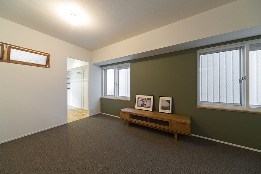 カーキー色のフリースペースは、窓が2つ、入口も2つ。子供が大きくなったら2部屋にしたり、ロフトをつくったり。ライフスタイルに合わせてカスタムできる可変性がポイントです。木製フレームの灯り窓は、輸入ガラスでデザイン