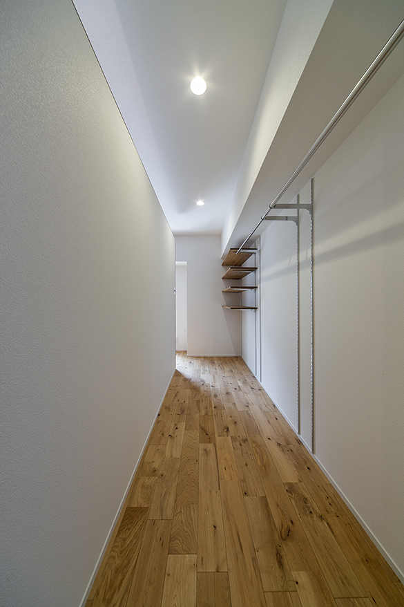 リビングからつながるウォークスルークロゼット。通路の片側に棚やポールを付けた感じが面白ですね。LDKの一角に壁をつくり、ウォークスルークロゼットにすることで住まいに回遊性が生まれ、子供たちも喜びそうです。リビンとの間仕切り壁は天井との間に隙間をつくり、圧迫感を解消しています