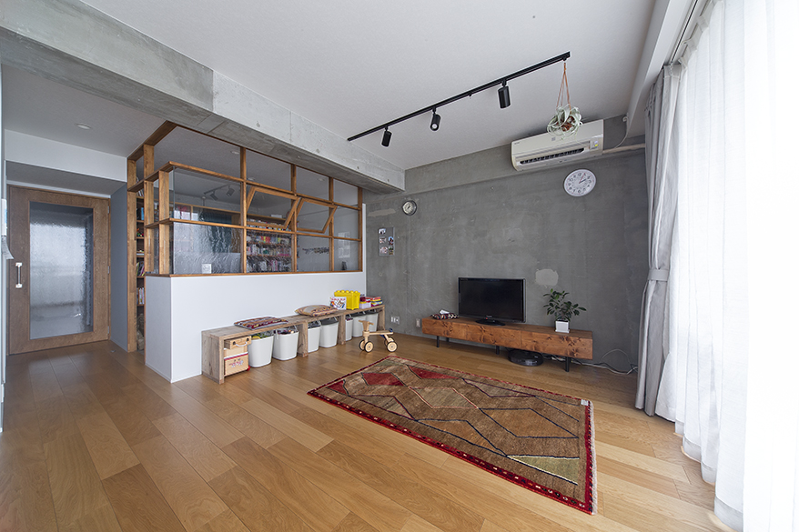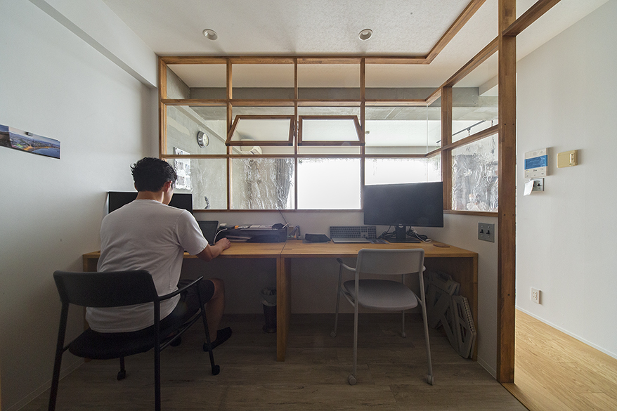 リビングとワークスペース、Kさんの想い通りゆるーくつながっております。ちなみに水廻りですが、コストを抑えるため、お風呂と洗面はそのまま使っています