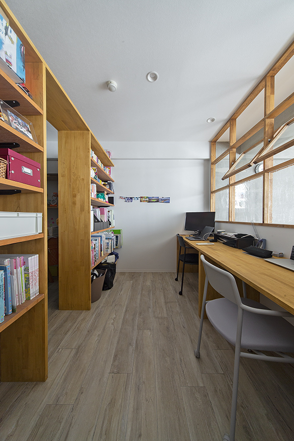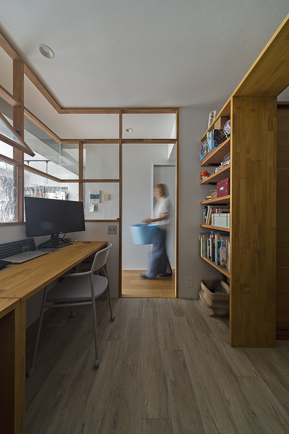 実はこのワークスペース、ゆくゆく寝室にも使えるよう、デスクは2つにセパレート可、ベッドがちょうど入る大きさです。本棚は「見せ場」になるよう、通路に見立てて存在感のあるつくりに。リビングのエアコンが使えるよう、本棚と天井の間に隙間をつくっているのもポイントです