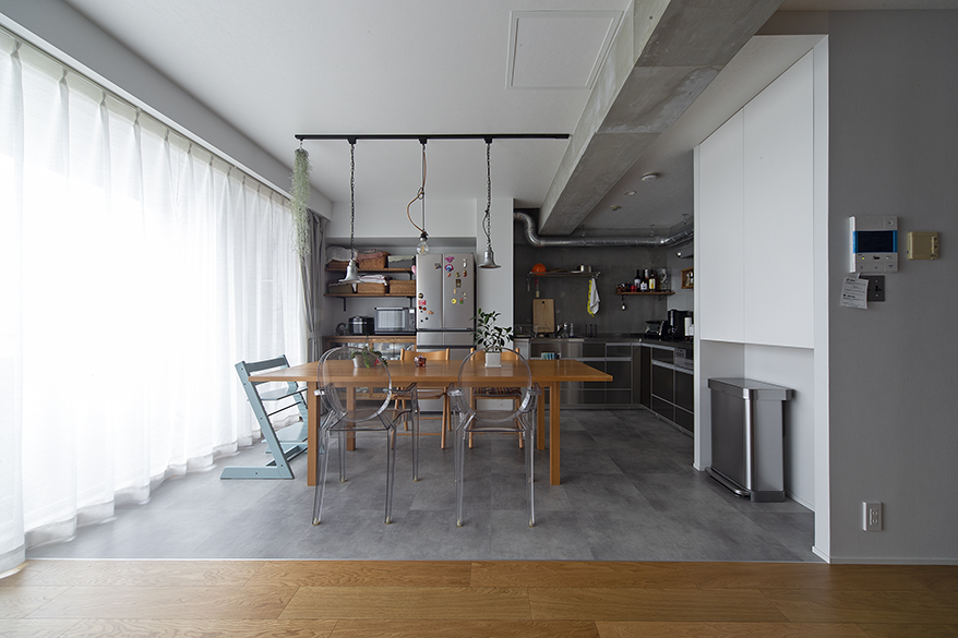 いろんなタイプの椅子とコーディネートした、大きなテーブル。これを主役にするために、L字型キッチンにしました。ゴミ箱の上に収納は、「ダイニングにモノを置くクセがあったので、この収納提案は、助かりました」。床材ですが、リビングはオークの突き板フローリング、DKはフロアタイルに切り替え、メリハリをつけました