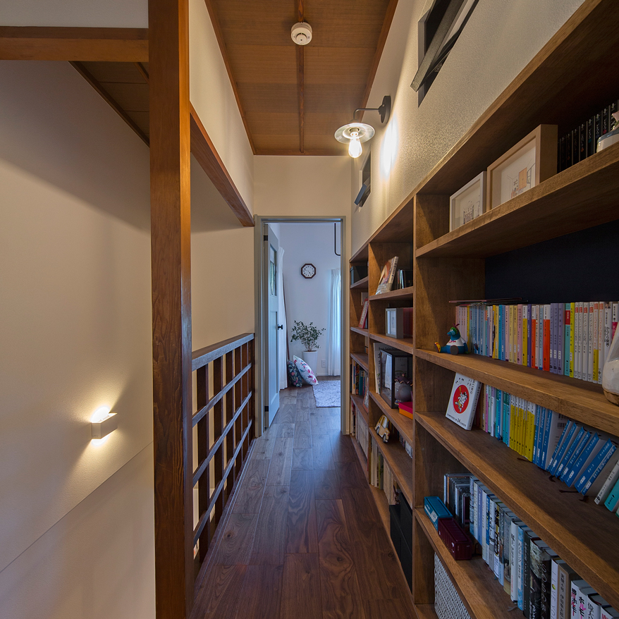 子どもの頃から「渡辺篤史の建もの探訪」が大好きだったKさん姉妹は、中古×リノベーションを計画します。重点を置いたのは、街選び。物件見学前に、「街を知るには自転車が一番」とその周辺を自転車でくるくる、予習します。遠い場所ならレンタサイクル!その後も何度か足を運び、駅前、夜の街、公園、緑、パン屋をチェック。そして半年間の入念な調査の結果、この街、この物件にたどり着きました。「実はこの物件、最初に見たときは道路幅も狭く、木々が生い茂っていて暗い雰囲気。でも、次に見た時には道路幅が拡張され、緑もすっきり。中から見える緑が決め手になりました」。そして、2人が気に入ったのが、2階踊り場にある正方形の格子です。昭和な竿天井もいい感じ。「ここを活かしたい!」という希望にこたえ、本が多いKさんのために本棚を組み合わせ、レトロなダークブラウンでコーディネート。「パースを見た時に、これこれ!とテンション爆上がり。気に入りすぎて、よくここに寝転んでます(笑)」。2階のセカンドリビングはテレワーク室兼客間兼物干し部屋。そこから寝室1→WIC→寝室2→廊下と回遊性をつけて、使いやすく楽しく。1階LDKは一転、シンプルナチュラルなテイスト。モールテックスのキッチンを中心に、風が気持ちよく通り抜けるよう洗面室をうまく配置。1階は広く、2階プライベートルームはコンパクトに、メリハリをつけました。