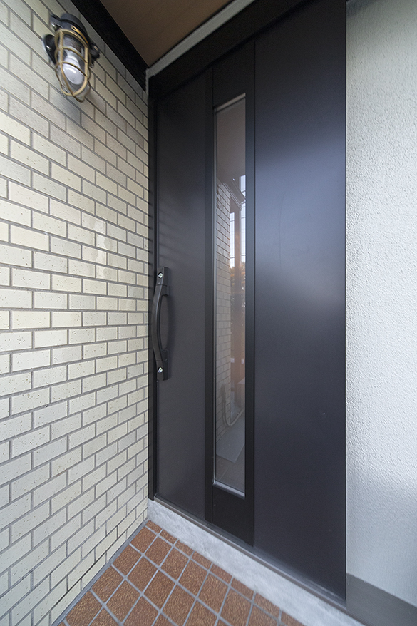 2枚引違い戸だった玄関。壁を増やし、1枚引戸にすることで、耐震性をアップさせました。実は、最初はマンションか、戸建てかで迷っていたKさん。「戸建てなら、1階と2階、別々にコーディネートできる!と思い、戸建てをチョイス。近くの公園が借景になった、ステキな戸建てを見つけました」