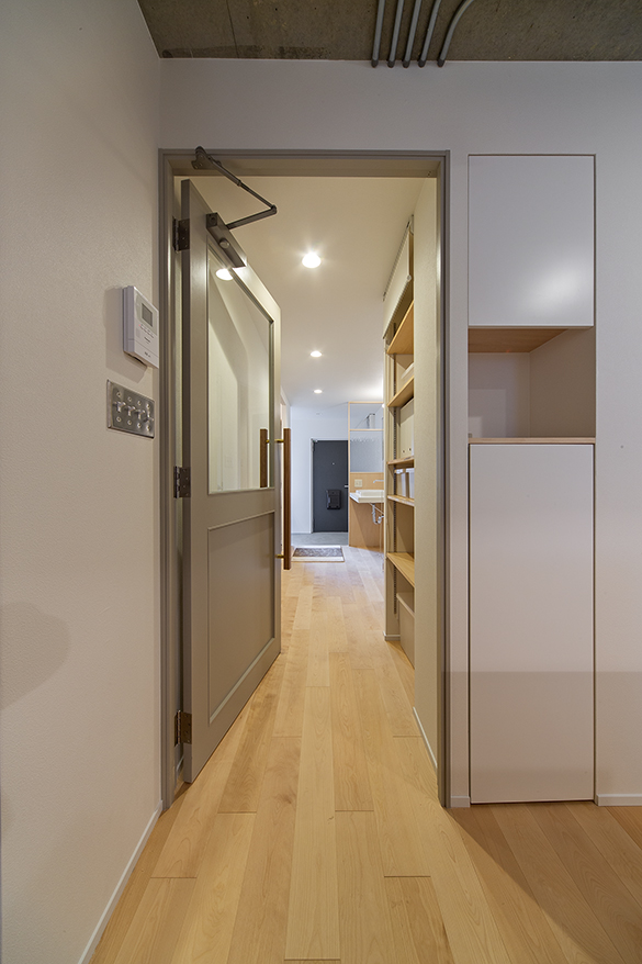 LDKのオリジナル扉は淡いグレージュに真鍮とオークの取手を合わせました。その右側が「充電ステーション」。上がWi-Fi、オープン棚にはコンセント、下は可動棚で棚を取り外すと掃除機が収納できる優れもの。スイッチは、ステンレスや白、ベージュなど部屋ごとにプレートを変えました。廊下にはデッドスペースを利用した可動棚。ロールスクリーンでスッキリ隠せます