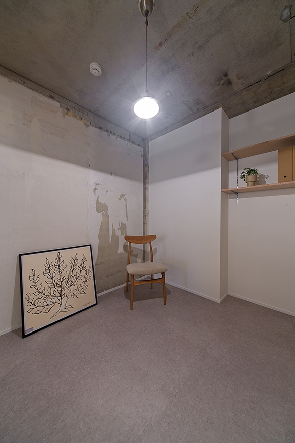ドアはなく、開口部でLDKとつながる寝室。天井は躯体を剥き出しに、壁はあえて壁紙を残して、ニュアンスを楽しみます