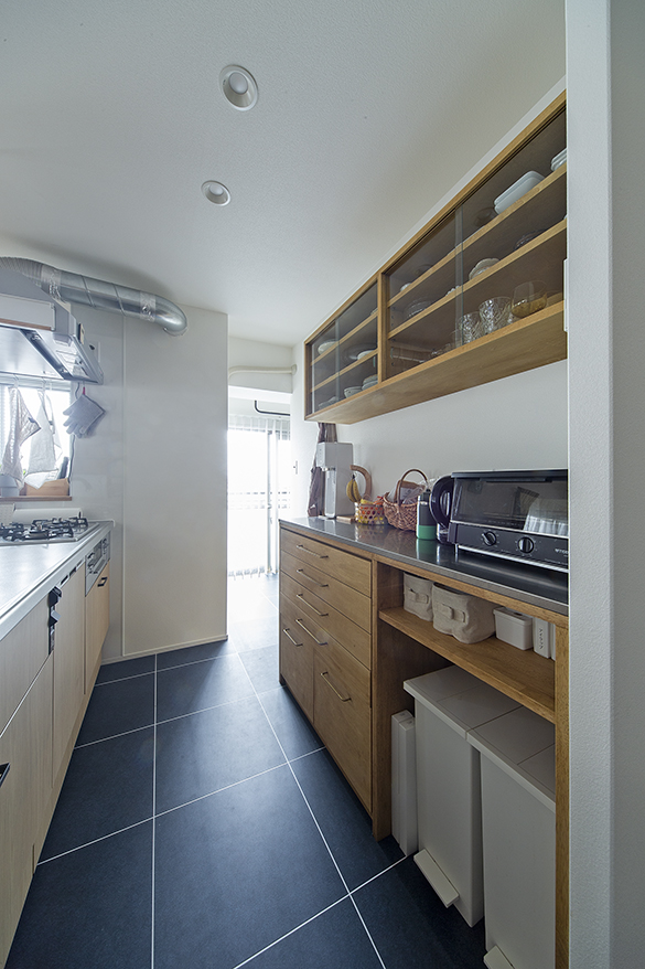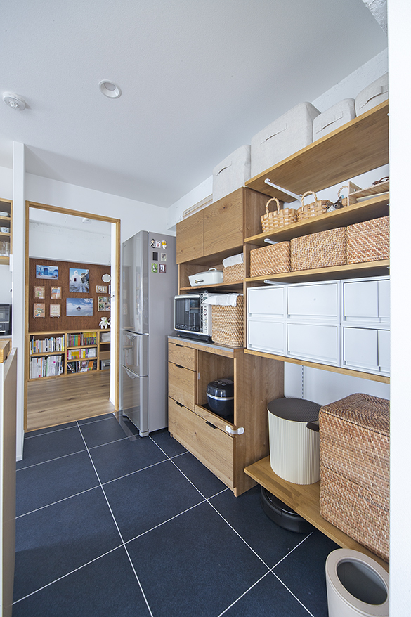 SOHOからまたキッチンへ。手持ちの食器棚に可動棚を組み合わせて一体化。収納やカゴが大好きなSさん、無印の素材違いのBOXやカゴが大活躍。「ピタッとハマると気持ちいいですね」