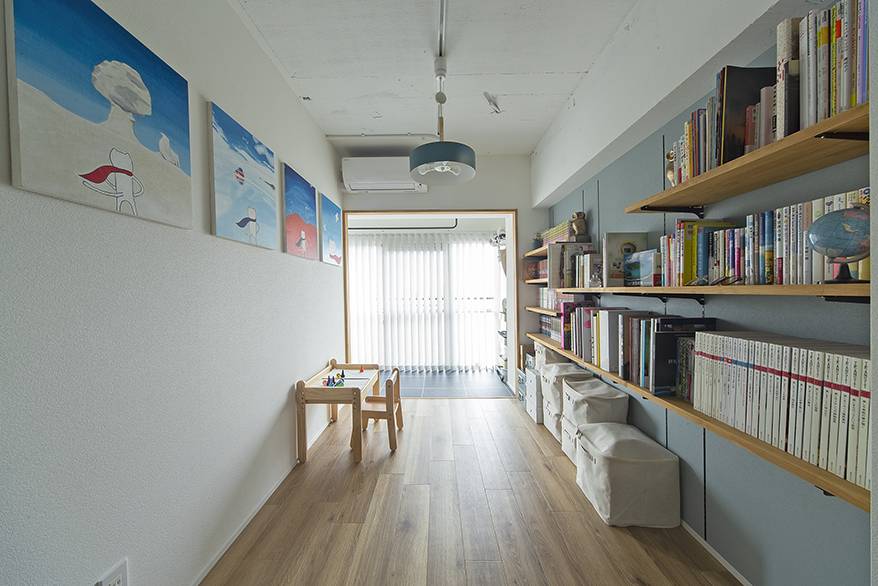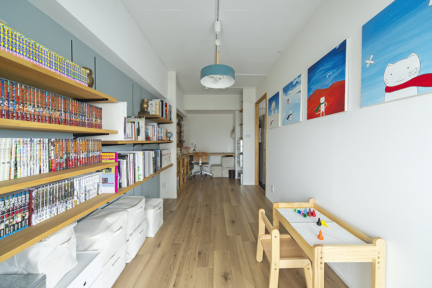 逆側から見たSOHO。右側にはオリジナル「ネコ」キャラがズラリ。左側は「絵本が飾れるように」とつくった可動棚、ちょっと凸凹した感じがかわいいですね。小さな子供の手が届かないよう、今は高めな設定。レールも埋め込み、絵を飾れるようになっています。奥にはL字型のデスクもつくりました。壁の有孔ボードも便利です