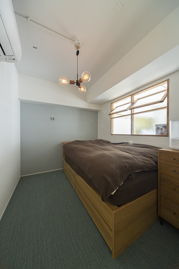 リビング横にあるのが、グレーでコーディネートした寝室、ミニマムスタイル。優しい色合いの灯り窓から、リビングの光を採り込みます。「寝室かSOHOか。どちらを子供部屋にしようか、思案中です」