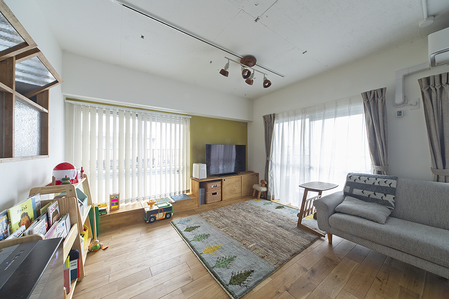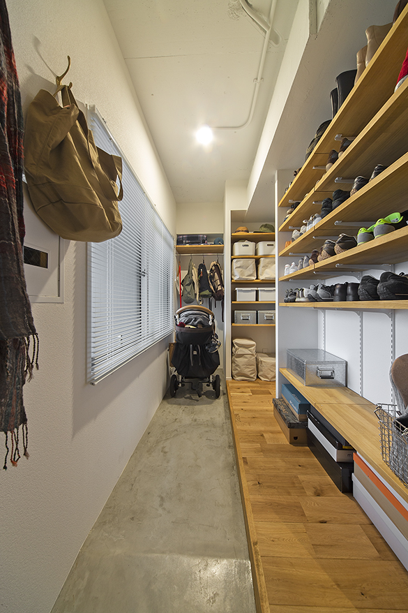 玄関は、ひと部屋分取り込んで、土間スペースとWICに。WICは土間スペース側にシューズ棚、奥を右にまわり込むと、家族のクロゼットが集約されています。旅行好きなご家族だからカバンがいっぱい、フックが大活躍。段差のあった土間スペースはスロープでつないで、バギーもラクラク。「子供がおもちゃの電車をすべらせて、遊んでいます」。職場が近かったUさんは、物件探しからお願いしました。「物件探しはスピード命!最初に気に入った物件はスグに決まってしまったので、決断力が必要だなと思いました。この物件は、駅近で広いルーフバルコニーがお気に入り。物件を探すとき、リノベのプロが一緒に見てくれるのも心強かったです」