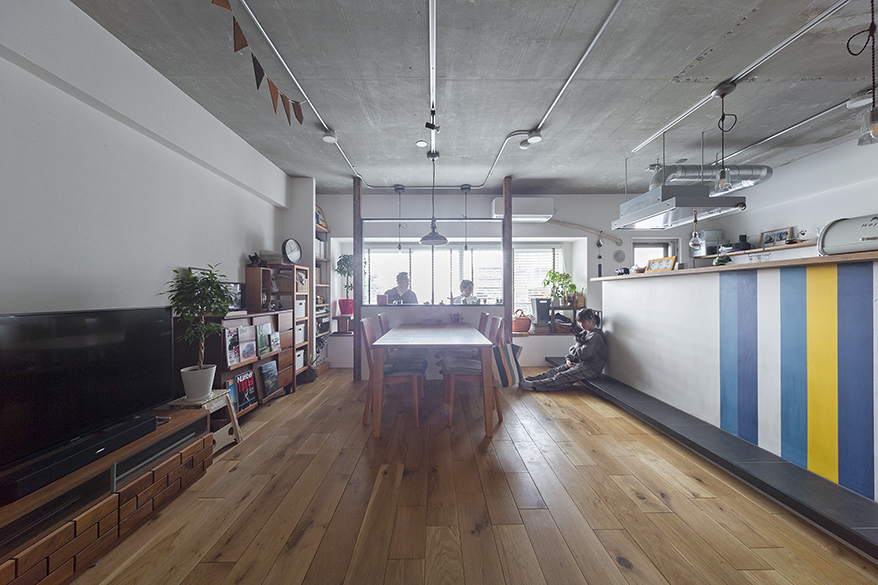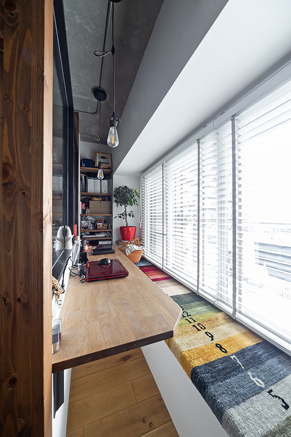 日当たりのいいバルコニー側に、ベンチとSOHOを作りました。細長くて、ナンバリングされたアートギャッベがぴったり。横に収納も造作しています。テレワークになったパパが使ったり、ママがPTA仕事で使ったり。そもそも、リノベーションした理由は?「2008年入居時に全面リフォームしていたこともあり、当時まだ割とキレイでした。でも、妻の戸建てへの憧れや、娘に部屋をつくってあげたいという思いもあり、リノベーションを選びました」