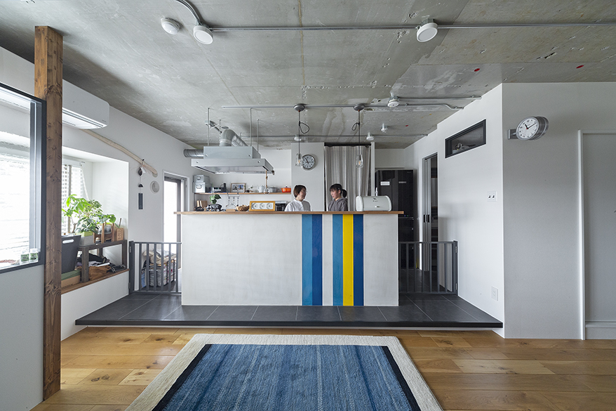 少し浮いているように見えるキッチンはモデルルームを参考に、フロアタイルはグレーに。「石垣島の藍で染めたストールとバッグの色使いがキレイだったから」と、そのカラーをキッチンカウンターで再現。想い出をカタチにしています。「ワンちゃん用の柵は市販でもよかったのですが、造作できると聞いてつくっていただきました」