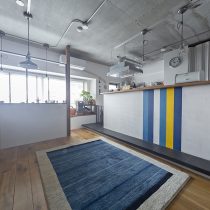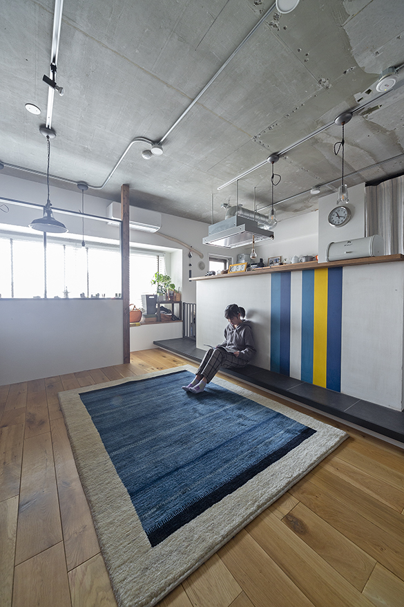 そして、柱×アイアン×ガラス張りのパーテーションで、SOHOとLDKをゆるやかに間仕切りました。光がガラスを通り抜けて、とても明るいですね。手元が隠れるようガラスの大きさに配慮。天井は構造躯体そのまま、床はオーク、壁はクロスでキレイ目に仕上げました。「リノベする時にパースを描いていただいたのですが、その中に登場していたのが青いアートギャッベ。3年越しで購入しました!」