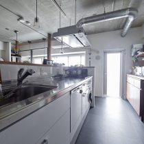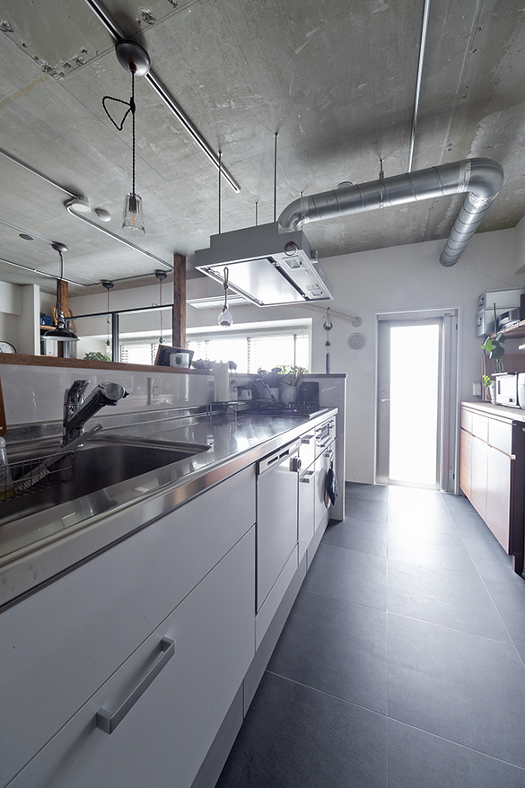 キッチンの奥は勝手口、バルコニーへとつながります。キッチンは既製品で、こちらも手元が見えないようカウンターをつくりました。キッチン収納は手持ちの家具+造作でたっぷり。そして、手前を抜けると…