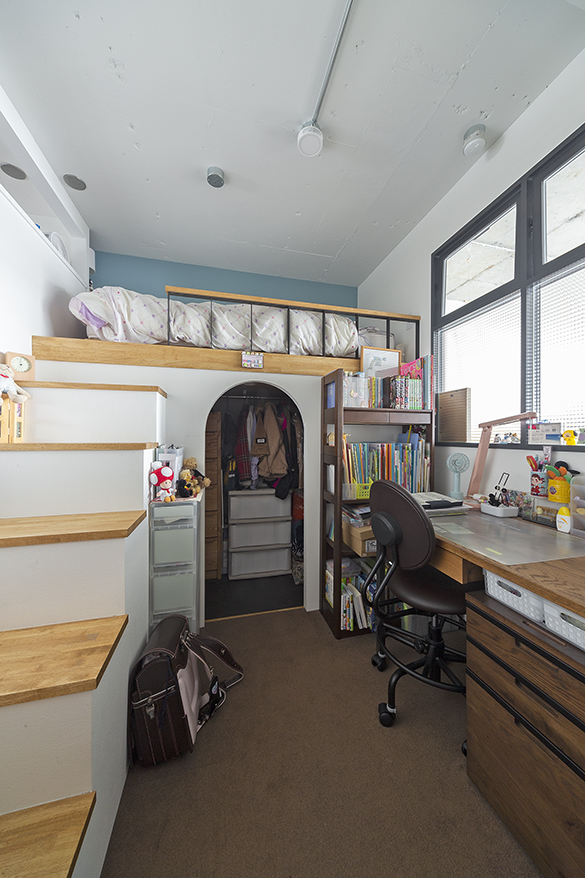 娘ちゃんのお部屋はミニマムで、まるで秘密基地。パパが「うらやましい」とつぶやいておりました。Rの向こう側がクロゼット、階段つきロフトベッドはシンプルハウスからの提案、ワクワクしますね。「娘の部屋が狭くなると悩んでいたので、ロフトができると聞いてびっくりしました」。ブルーグレーの壁は娘ちゃんチョイス。ベッドの横の開口部はパパママの寝室とつながり、エアコンを共有します。灯り窓をあけると、風が抜けて気持ちいいね