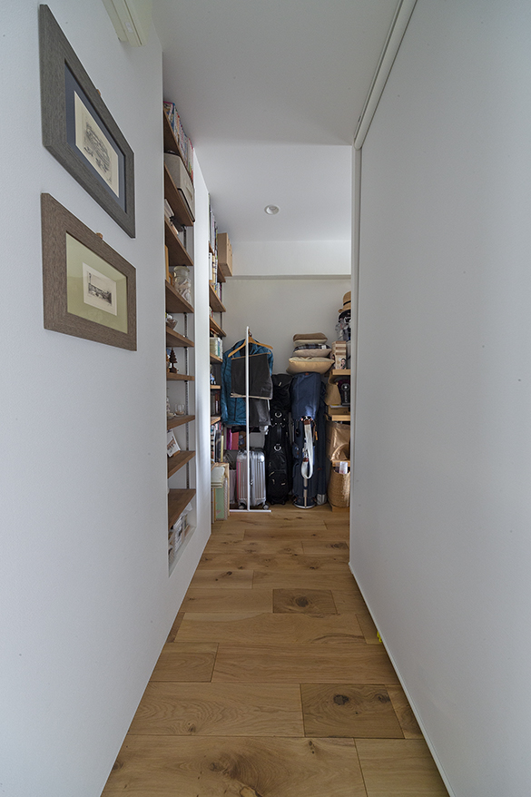 キャンプが大好きなYさん家族。玄関から、廊下からアクセスできるWICは、棚を細かく設計し、アウトドア用品や洋服、バッグ、布団、スーツケース、本、生活用品などが各コーナーにおさまります。この中に、手持ちの家具もすっぽり。この写真は、廊下からアクセスしたスペース。本棚があって、図書コーナーの趣ですね。最後になりましたが、シンプルハウスに決めた理由は?「ある日の夕方頃、シンプルハウスに飛び込みでリノベーション相談をしたところ、当時の店長が快く対応。想いをしっかり聞いてくださったことから、お世話になろう!と決めました。うちもキャンプ用品が多かったので、野球道具を納めた土間収納(施工例)も魅力的でした」