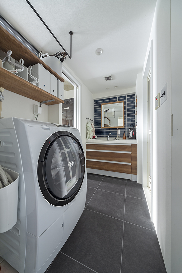 こちらの洗面室へとつながります。洗面台の下側は既製品を再利用。上側にタイルを貼るだけで、オーダー感が出ますね。ミラーボックスは意外と収納力大。アイアンバーは、「洗濯物をセッティングしてから干せるのでとても便利」と好評です