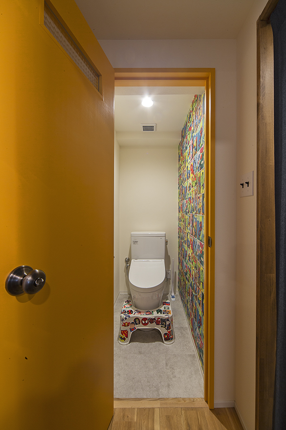 お部屋の中で特に目を惹くトイレ☆黄色の扉とアメリカンコミックMARVELの輸入壁紙の組み合わせを気に入って頂きました。リノベあるあるですが、トイレだけガラッと印象を変える事が多いですね~色や柄など思い切った内装にしてみるのもお楽しみにのひとつです♪収納に関しては、前のお住まいへ訪問させて頂き、物量を確認することで、より最適な収納を計画することができました。もちろん家具や敷物のサイズも、プラン段階から計画できるところがリノベならではですね!