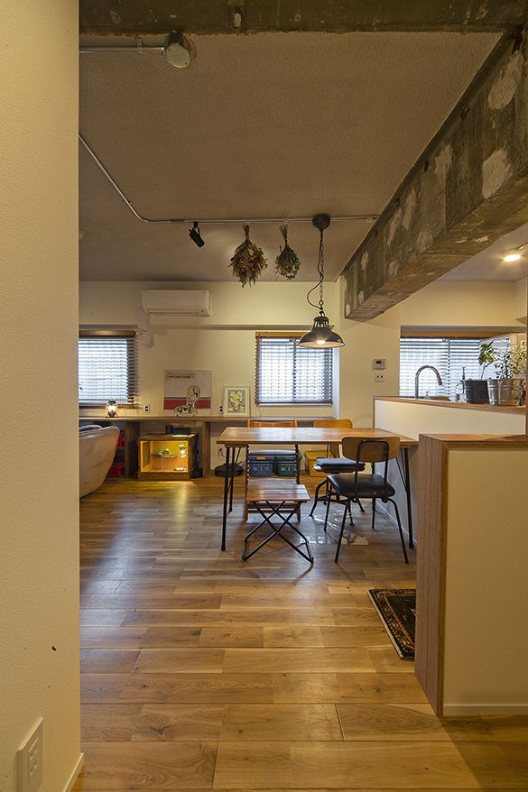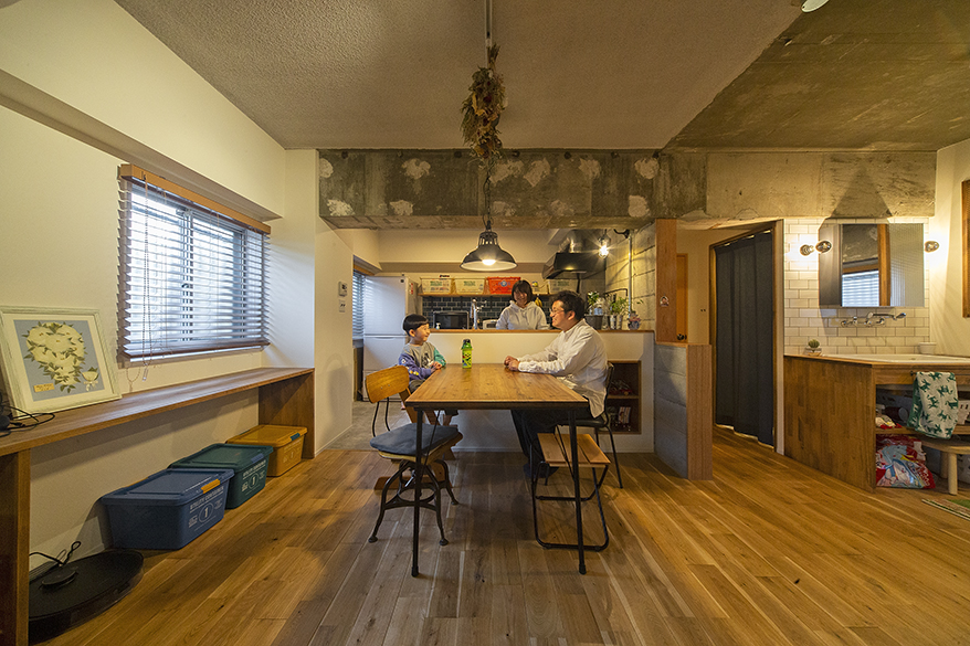 床はオーク、天井は剥き出し、壁はクロスで仕上げました。梁の壁紙を剥がした跡、なかなか個性的ですね。キッチンカウンターは、ダイニング側にニッチの棚を造作。この「ちょっとした棚」が便利なんです。LDKに洗面、浴室、トイレを取り込んだ設計で、タイル×木製のオリジナル洗面台も違和感なし。脱衣室はドアなしのカーテンに。「最初洗面台は脱衣室に入っていたのですが、狭くて外に出しました。子供が帰って来て、すぐ手洗いできて、便利です」