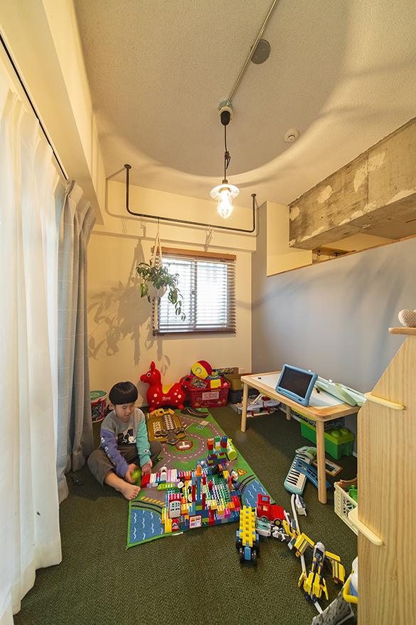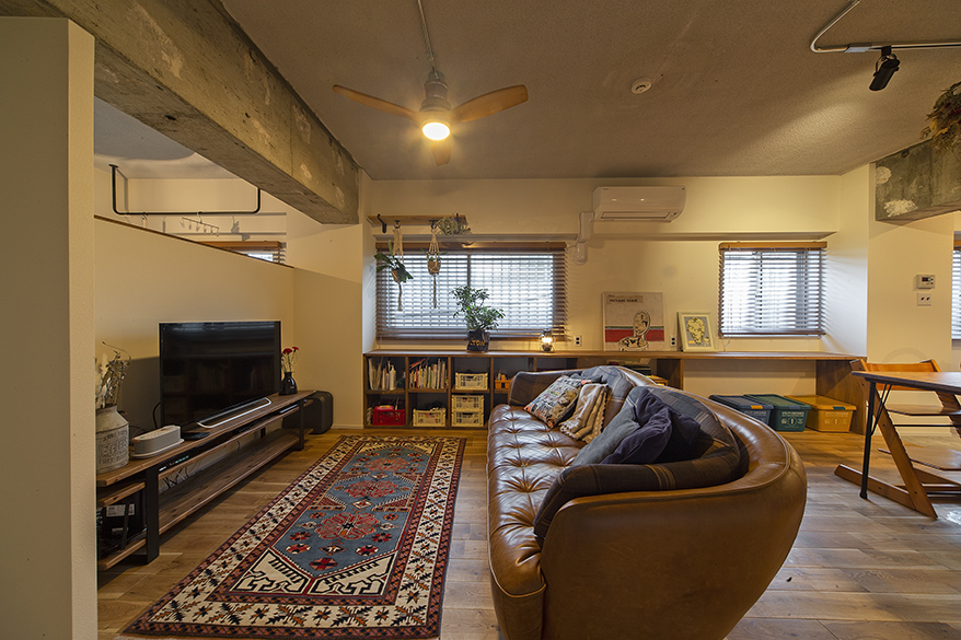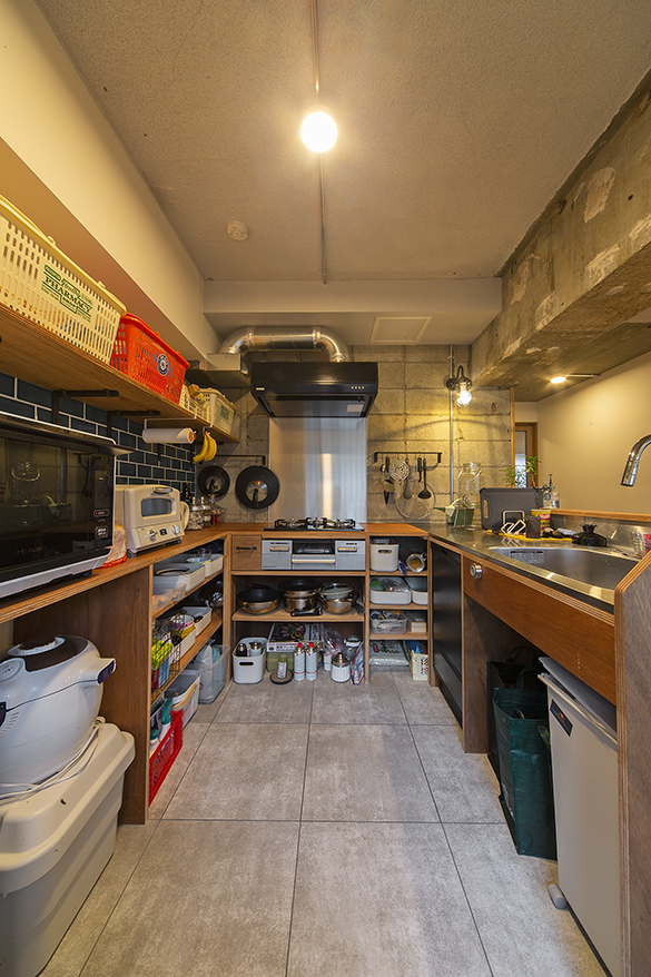 Tさんには、面白びっくりエピソードが2つあります。1つ目。友達がリノベーションして、いいなあと思っていたTさん。ヌー茶屋町に遊びに行った時に、「あ、友達がリノベしたとこだ!」となぜか勘違い(笑)。オープンハウスも気に入り、数年後にシンプルハウスでリノベーションすることになりました。「途中で違うと気づいて驚きました」とTさんは笑います。2つ目。Tさんが「学区もいいし、何より建築家・遠藤剛生さんのデザインが気に入って」購入したこのマンション、実は上の階もシンプルハウスがリノベーションしていました!このマンションは変形間取りが多いのですが、上下階なので間取りがまったく同じ。「すごい偶然ですよね(笑)。見学させていただき、プランの参考にしました」とTさん。さて、肝心のリノベーションです。この家は、窓が4面もある細長―い空間なので、それを活かして窓側に棚をつくりました。それでも少し長すぎる。そこで、天井までない壁でゆるゆる間仕切り、キッズスペースをつくることで、メリハリをつくりました。タイル張りのオリジナル洗面台は、LDKの中でも違和感のない仕上がり。むしろ、キッチンとシンクロして、いい感じです。浴室やトイレへダイレクト動線なのも面白いですね。そして全体はどこか倉庫っぽい、インダストリアルな雰囲気。転勤族だったTさんは、見た目もイケててスタックできる折コン(折りたたみコンテナ)やブラスチックコンテナを、うまく使って収納しているのが印象的でした。※ちなみに上の階は「引き渡しからスグ住めたね」のIさんです。