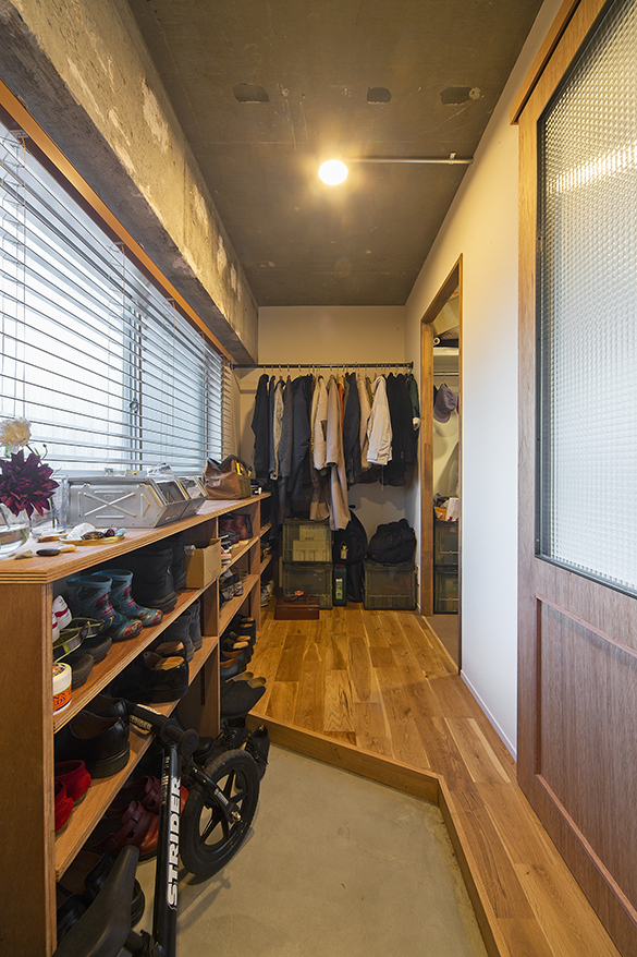 窓は光も風も入るけれども、Tさんのおうちは1階。通行人と目が合ってしまったり、宅内の気配が溢れすぎないように、窓辺には収納や土間など外部との緩衝空間を設けました。リビングと子供部屋の間の壁は天井までないので、そこから光が入ります。