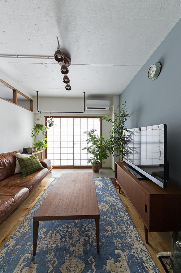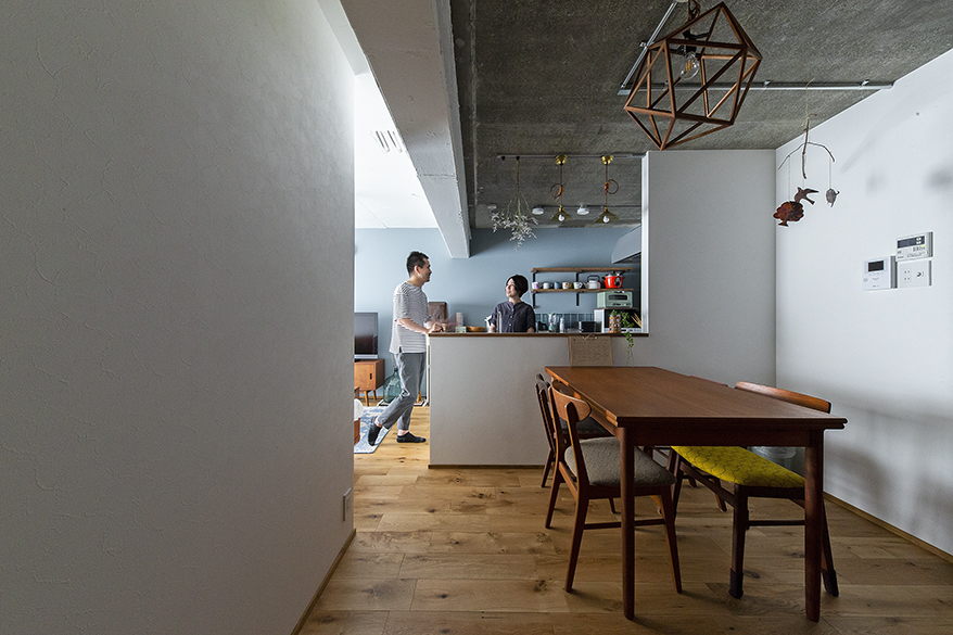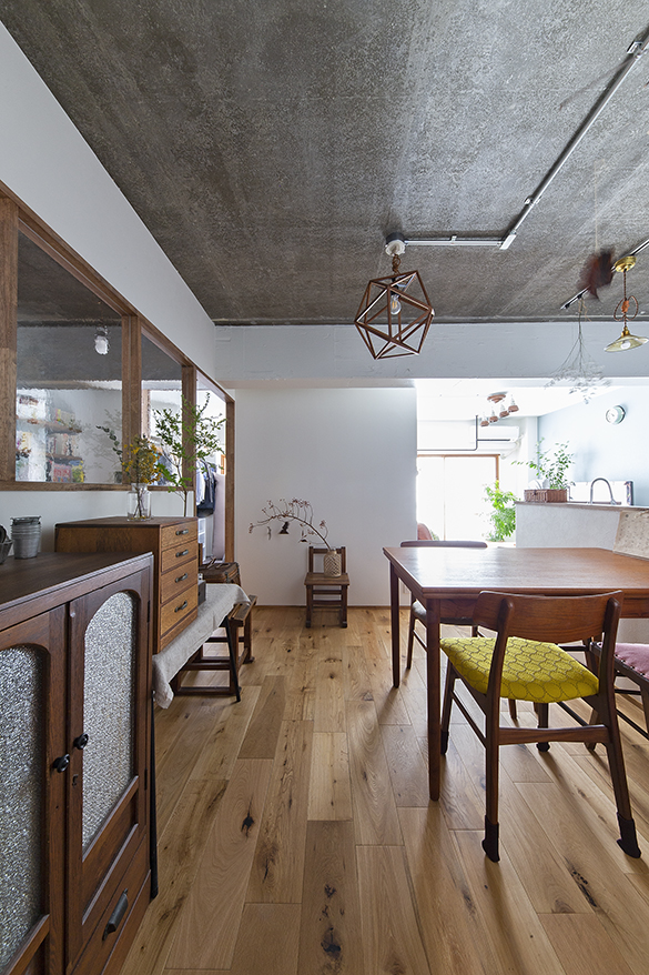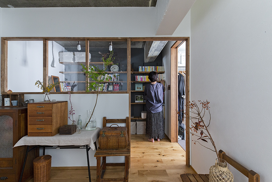 「阿倍野が大好き!」。開口一番、うれしそうに話すNさん夫婦。実は高校の同級生だというふたりの高校も、阿倍野にあるそう。「再開発でタワーマンションや商業施設が増えているけど、一歩路地を入れば昔ながらの町の趣も残る。そんな阿倍野を20年も見守ってきました」。そして、このマンションに不思議なパワーというか、親近感を感じる妻は、リノベしていない物件を待つこと3年。ようやく、手に入れます。リノベのテーマは「日本の小家具に合うリノベーション」。畳文化でつくられてきた和家具は、どれも小ぶりで愛らしくて。土間スペースにポツンと佇む、下駄箱とホウキとバスケット。SOHOの灯り窓のフレームと響き合う、水屋や机、小引き出し、椅子、バスケット。和室だったバルコニー側は、障子を残してインナーバルコニーをつくり、縁側のある応接間が誕生しました。「余白」と「つくり込み」のバランスで、小家具を空間に馴染ませる。そして、そのひとつひとつのシーンが、あっち曲がってこっちの隙間をすり抜けてつながる、空間構成もとてもユニーク。「大好きな町の大好きなマンションに、大好きな家ができました」。Nさん夫婦、とてもうれしそう。