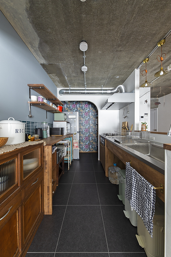 なんだか凸凹しているキッチン。天井は剥き出しと白塗装のバランスがいいですね。「仕上がりのイメージが湧かなかったので、実際に壁紙を剥がし、相談しながらこのバランスを決めました」。キッチンのブルーグレーの壁紙が素敵です。その中は…