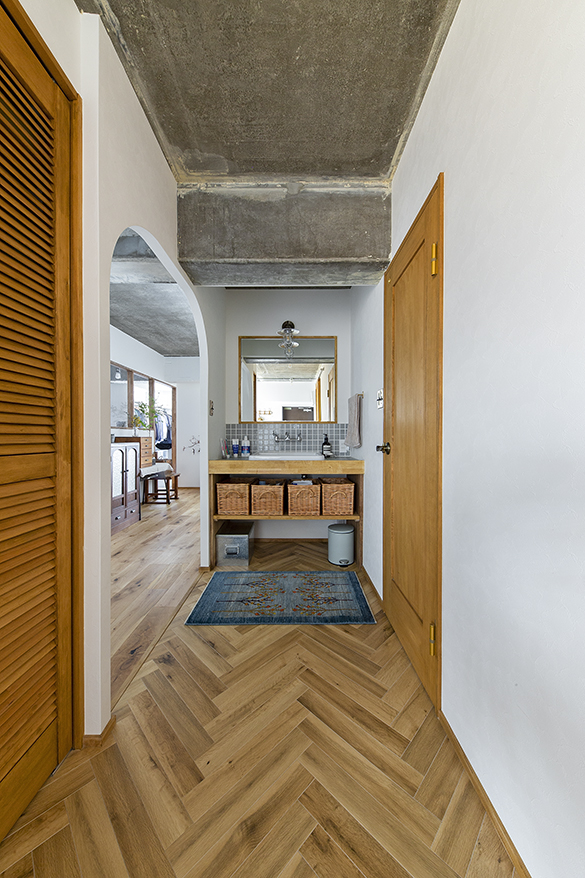 この景色をつくるため。洗面台は、浴室をサイズアップしたため、廊下に出しました。ママが選んだタイや収納のルーバー扉がいいね。「建具は妥協したくなかったので、無垢のルーバーを選びました」。廊下のヘリンボーンですが、実はフロアタイルです。少し高さがあった廊下と、無垢床にしたLDKの高さを一緒にするため、廊下側は薄いフロアタイルにする工夫でフラットな仕上がりに
