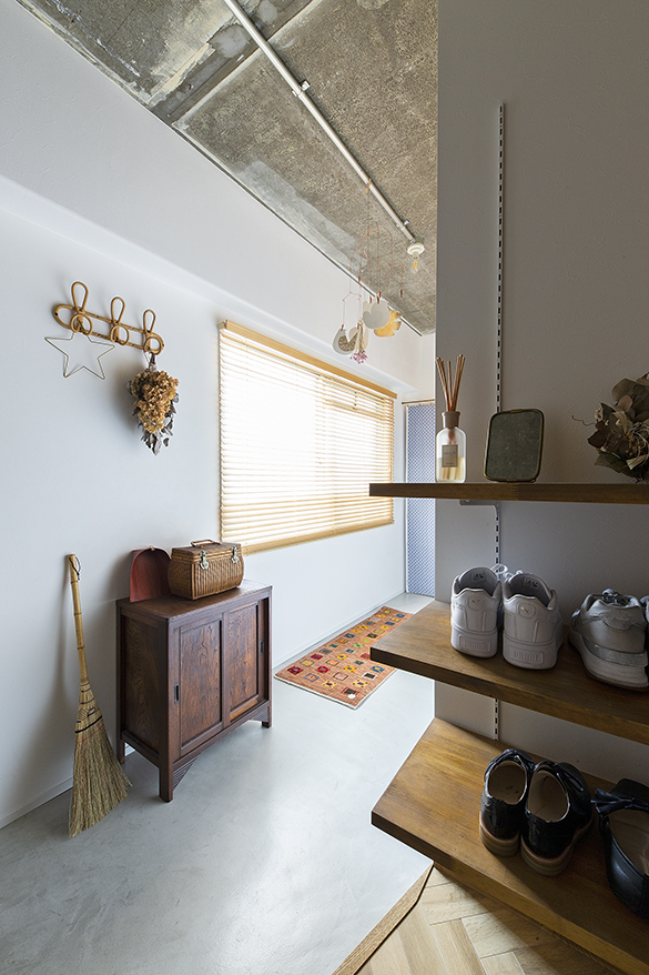 土間スペースはすっきりとしています。バスケットやホウキと一緒に鎮座するのは、草履がおさまった小さな下駄箱。ポツンと佇む感じもいいですね。ところで、シンプルハウスを選んだ理由は?「R不動産でシンプルハウスが販売していたリノベ物件を見たことがあって、いいなと。天神橋本店でクッションを買ったときに、『ああ、あの時のリノベ物件!』とつながり、お願いしました。物件購入前に現地調査に同行してもらい、見てもらったのも安心できました」