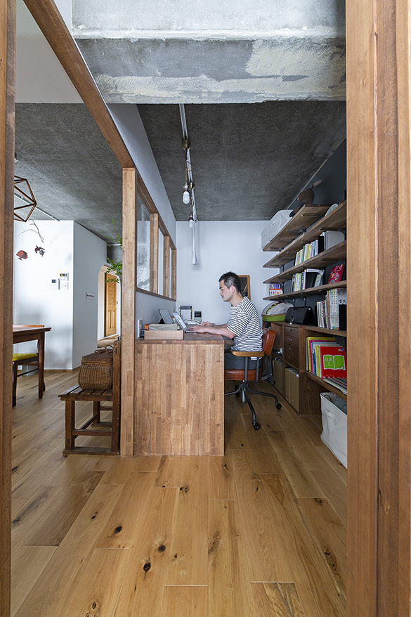 テレワークを想定してつくったSOHO。デスクや本棚をカスタマイズ、椅子はトラック製です。電気工作をされるそうで、ダクトレールから電源が取れるようにしました。扉のないオープンスタイルで、ちらりと映り込む小さな椅子とバスケットが、これまた素敵です。この住まいは視線の抜け感がいいですね