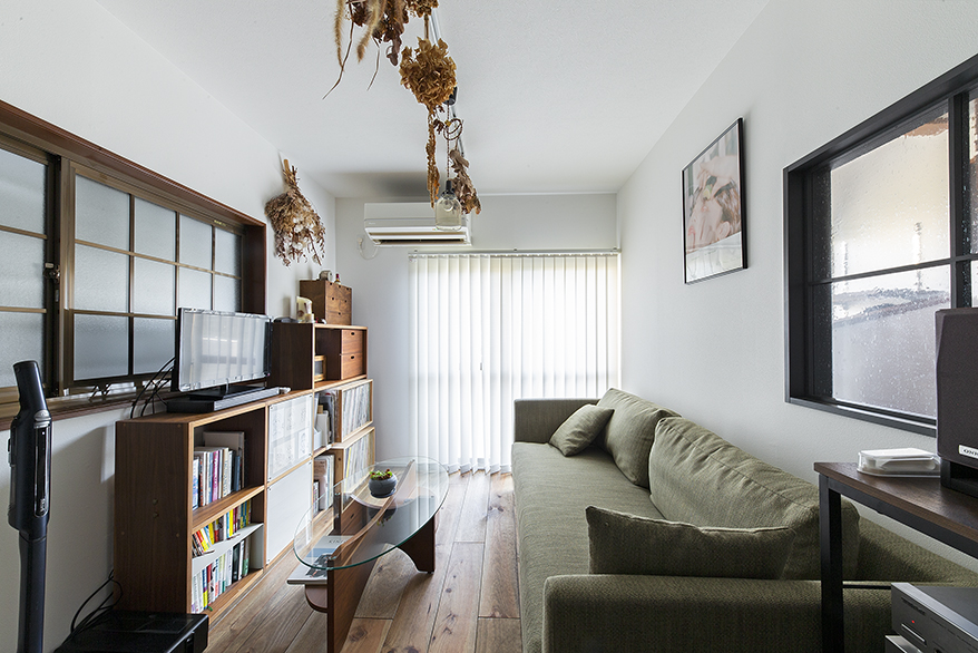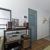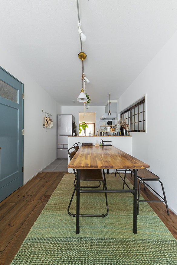 1階リビングはレトロな格子窓や手持ちの古道具に合わせて、ボルドーパインの無垢床を選択。ドアは1つつぶして灯り窓に。掃き出し窓はインナーサッシを取り付けました