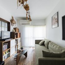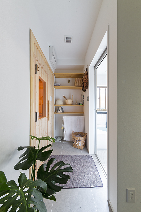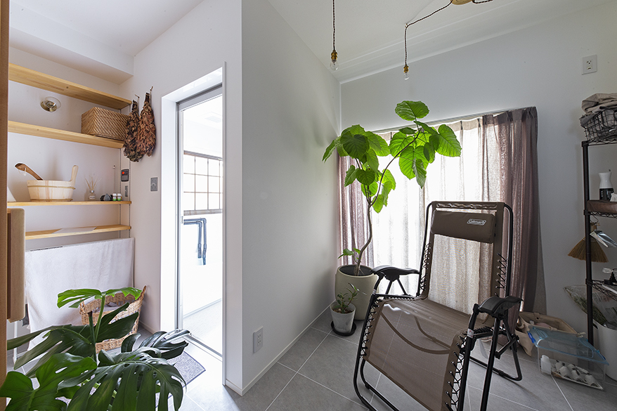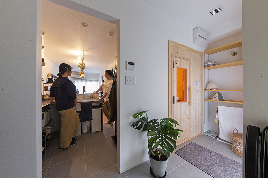 おうちに、サウナ。素人は、「お金はかかるかもしれないけれど、家庭用サウナを取り付ければいいんだよね」と思います。いやー、それが違うのです。正しい「サ道」(サウナ道)は、サウナ→水風呂→リラグゼーションルーム(外気浴)。この3つがあって、初めて成立するものなのです。パートナーの影響から「サ道」に目覚め、サウナ好きが高じて、「サウナスパプロフェッショナルマネージャー」の資格まで取ったFさん。「自宅にサウナを作りたい」と思い、まず調べたのは水風呂でした。「家庭用サウナはあるけれど、水風呂がなくて。最適な水風呂の温度は15℃、水道水は少し高めなので、冷却する必要がありました」。どうにか水風呂を作れないか。ネットで調べまくって辿り着いたのが、観賞魚水槽などに使われる、水を冷やすチラーでした。「このシステムを水風呂に使っている前例があったので、できる!と確信しました」。そしてFさんは、戸建て購入に踏み切ります。チラー(室外機)を置く場所が限られるので、チラーから一番近い場所に水風呂を配置。それを拠点に、フィンランド式サウナ、リラグゼーションルームのトライアングルをつくりました。それが、キッチンの奥にあって、「隠れ家的」で面白い。はじき出された洗濯置き場は2階に移動することで、「洗濯動線が2階で完結するので便利です」と好評です。建物のポテンシャルを大切に、「使えるものは使う」と廊下や階段などはそのまま、1階LDKは昭和な格子窓に合わせて、無垢床にボルドーパインを選択。大事な手持ちの古家具に似合う、レトロな住まいが完成しました。そして、平日1回、週末1回のサウナライフ。まずは、4時間かかる水風呂を作りから始まり、その日のロウリュウの香りや音楽を選び、チェアやサウナハットを用意し、ご飯やビールを準備しておく。「それが、サウナの世界に入り込む儀式なんです」とFさん。サウナ・トライアングルを3セット繰り返すうち、呼吸が自然と深くなり、自分に向き合える。「ととのう」をこっそりかみしめるFさんです。