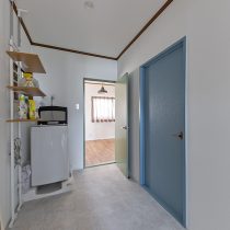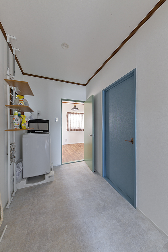 1階に置く場所がなくなった洗濯機は2階へ移動。トイレと収納を諦め、踊り場を広々ランドリールームに刷新しました。洗濯動線は2階で完結します。ドアは再利用、パートナーが好きなグリーン系、Fさんが好きなブルー系にそれぞれ塗装しました