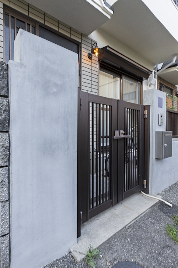 外壁はリブブロックの上から左官モルタル仕上げ。表札やポストもトータルコーディネートしています。ベランダ、外壁、屋根は防水塗装を施しました。ちなみに、この中古戸建ての決め手は?「セルフィンで100件弱くらいの物件から見つけました。リビングから見える畑ビュー、想像力をかきたてられるレトロな建物、車が入れない少し奥まった場所にあるのもいいなと」
