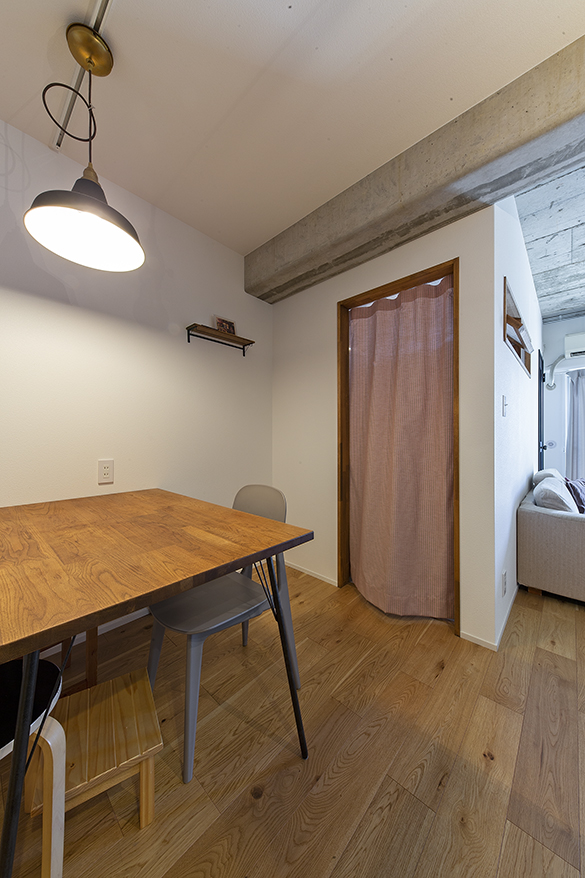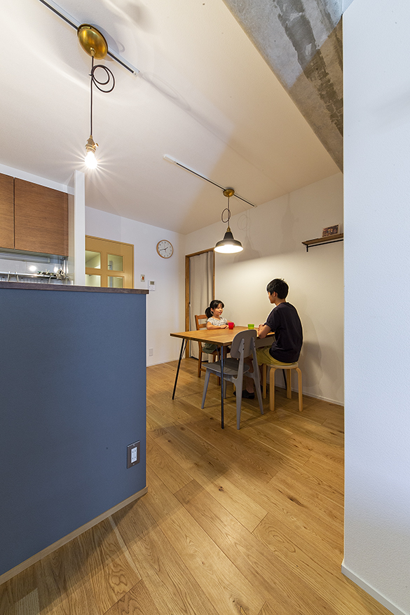 今回のリノベのポイントは、「諦めない部分最適化」。なるべく既存の間取りを活かし、使えそうな(これからもまだまだ頑張ってもらいたい)扉やキッチン本体は、塗装や表面材の入替でイメージチェンジ。天井のコンクリート剥き出しやタイル、風合いのある床材など内装の核は諦めずに採用しました。そして大事なのがFさんの足るを知る精神。リノベ中はあれもこれもと触手を伸ばしがちですが、キッチンの改善と子供部屋の実現、と目的を2つに絞ることで限られた予算でも豊かな空間を手に入れられました。